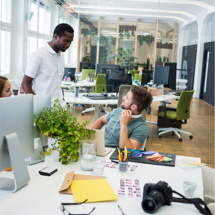 Two professionals walking and talking in a bright, modern open office with glass walls and wooden flooring, while two colleagues collaborate in the background.